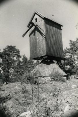 This is a complete reconstruction of the old mill that stood on the site and the workmanship is of a very high order, but unfortunately when visited there were no sails or tailpole. Unusually, the mill has an octagonal roundhouse with a roof sloping down to the ground. The crosstrees rest on solid rock; they are doubled and so are the quarterbars, i.e. sixteen in all, 8 in. by 9 in. deep. The post is 32 1/2 in. sq. at the base, built up of sixteen pieces. The roundhouse is approximately 21 ft. across inside and the height of the mill overall is 33 ft. 6 in. Below the bottom floor of the mill is a collar and the sheers extend backwards and support the ladder at the tip. The octagonal wooden windshaft, 14 in. across the flats behind the brakewheel, has an intermediate journal bearing on the rear tie beam. The body of the mill is cross-braced with double side girts, and at all main corners there are knees of spruce; all other construction is in pine. Above the tail journal was a woodpecker's nest and in the rear of the right-hand side of the mill body a hole through which the woodpecker had gained entrance. The clasp-arm brake wheel is 7 ft. 6 in. diameter with sixty cogs, driving a lantern pinion with twelve staves dove-tailed in. Both staves and cogs are of birch and the wooden brake is built up in short wooden segments reinforced by an iron band in sections on the outside. There is an underdrive for a single pair of composition stones through two cast-iron spur-gears which are tentered from above with a cast-iron hand-wheel almost at floor level. The twist peg for the shoe is on the horse and has a ratchet.
