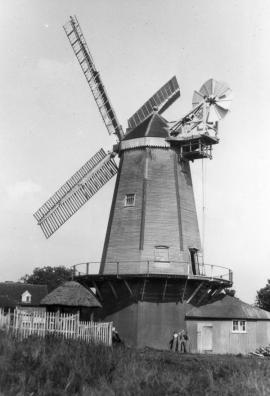 A general view of the mill showing the sweeps and fantail. Outbuildings are attached to the mill's octagonal brick base.