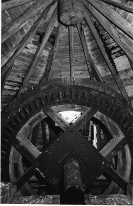Interior view of the cap showing the brake wheel, cap rafters and the underside of the central finial.