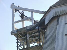 It nevertheless manages to be a splendid example of the millwright’s art. The reused timbers appear to have come from the post mill known as Honeypoles which the new smock mill replaced. Perhaps because regional millwrighting trends had been forgotten to some extent with the decline of the windmill, the cap is an eight-sided cone with a scalloped petticoat instead of the usual Sussex dome. The mill has patent sails and fantail and stands on a two-storey brick base with a stage. It has an iron windshaft, wallower and great spur wheel but a wooden brakewheel and upright shaft. Three pairs of stones are underdriven. Because of its size the mill has room for plenty of auxiliary equipment and the spout floor in particular is a Mecca for lovers of old machinery, with a smutter, oat crusher and a flour dresser with feeder mechanism. There are also a second dresser on the stone floor and a jog scry on the top floor of the base.