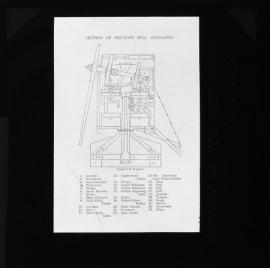 Lantern slide showing a cross section drawing of the post mill - date not known.