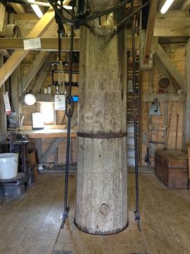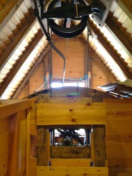 Interior photograph of Oldland Windmill, showing the bin floor and sack hoist.