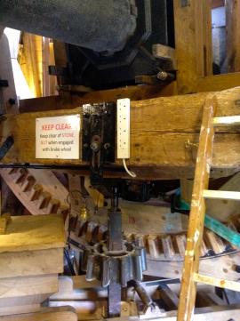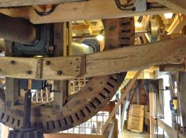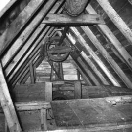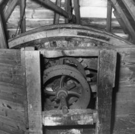 Interior image of Oldland Windmill, with detail of the sack hoist drive - date unknown.