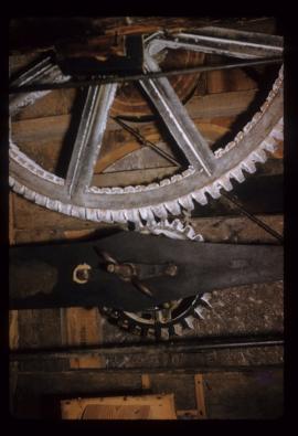 Interior view showing part of great spur wheel, stone nut and bridge tree below millstones