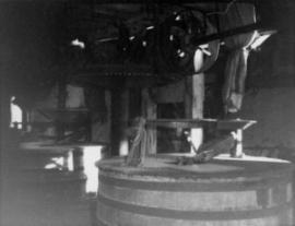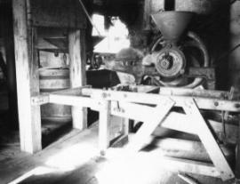 A 1965 image of two pairs of newer millstones, the crown wheel and line shafting.