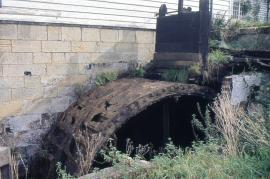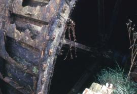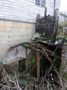 Rob Cumming Inspection 12/10/1985: :- “Waterwheel is about 14ft 10” by 4ft wide, with two sets of 12 arms, and is overshot. Penstock is in very bad repair. Iron pit wheel is about 8ft in diameter with 72 cogs, and it drives an iron wallower, 2ft 6” in diameter with 22 cogs. On upright shaft is spur wheel, about 9ft diameter with 128 cogs. Two pairs of burr stones visible, one pair has been displaced and the runner is lying on top of the other pair. There is a single pair of governors for both pairs of stones. Crown wheel is 7 feet in diameter with 90 teeth and drove two layshafts. The sack hoist is belt driven. No flour dressers, but there is a Bamfords Corn Cleaner belt driven from a layshaft. In an extension there is a large elevator with a diameter of about a foot. The mill building itself is a white weatherboarded wooden structure embanked by a small mill pond. It is owned by Bradleys Agricultural Fertilisers, and worked until the late 1970’s, when the penstock collapsed. Millwrights estimate £4000 for its repair. The wheel is deteriorating seriously.”