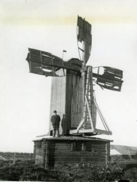 This mill has a tall, vertically boarded body with a gambrel roof, equal oar-shaped sails, and a platform built out from the base of the breast to carry a support (which is also a ladder) for an outboard bearing at the extreme end of the windshaft. It is the only known hollow-post mill to have this arrangement. It has a square stone chamber of interlocked timber construction and a boarded roof.