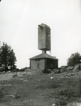 The mill had a tall narrow body of medium size and a gambrel roof; it stood well above the stone chamber below exposing the square hollow post. The body was obviously framed and horizontally boarded, while the stone chamber was of interlockied construction with a boarded roof.