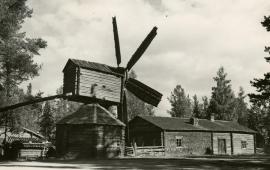 This mill is at Ruovesi Parish Museum, moved from Heittola Farm, Kurjenkylä, Virrat. Its date of building, 1861, is written in charcoal on one of the beams inside the stone chamber. The very small mill body is 6 ft. wide, 11 ft. long and 11 ft. 6 in. high, plus the sheers which are 8 in. square. To turn the body there are twin tailpoles, held at the top inside the mill; a stretcher between them holds a small extension tailpole coming down to within reach from the ground. The hollow post, 26 in. diameter, is framed in four pieces and there is a framed crowntree under which the inclined tailpoles pass. The stone chamber is 14 ft. square and the mill is 23 ft. 4 in. high. It is built up of 6 in. square timbers adzed up with dove-tailed tenons at the corners. There are four crosstrees 11 in. square, in clasp-arm formation halved over each other, and there are eight quarterbars 9 in. square.