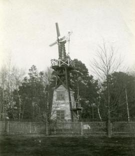A windmill constructed by E Lancaster Burne to provide electricity to "Tangley Way," the house of Mr Kennedy, c 1923. It was still standing in the 1960s, but the upper part was later demolished leaving only the base.