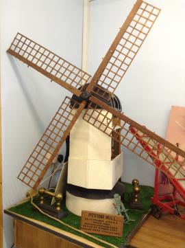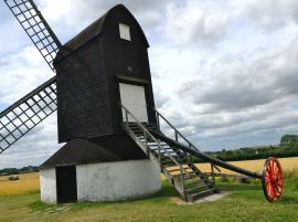 This Grade II* Listed post mill was in existence by the 17th century. Several dates are inscribed in the building, the earliest of which would seem to be 1627 (although it the inscription has been read as 1687 or 1697). It ceased working after the tail and sails were destroyed by a storm in 1902 and fell into disrepair. In 1937 it was given to the National Trust. It was restored to working condition by the Pitstone Windmill Restoration Trust Committee between 1963-70. With a black weather-boarded buck above a roundhouse, it has 4 common sails, adjusted from ground level. The mill remains in workable condition, although fixed in direction.