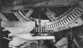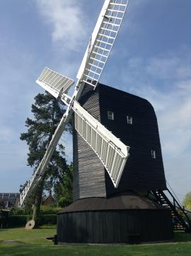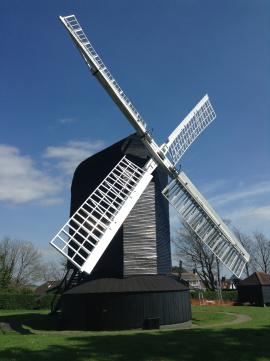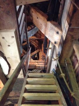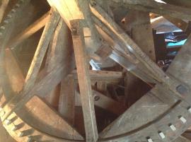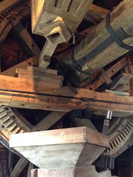 Inside the mill are two pairs of millstones set in a head-and-tail arrangement, driven by an enormous renewed brake wheel and the original tail wheel. The windshaft is of wood, with a cast-iron poll end, and carries two spring-shuttered sails and two canvas-spread common sails.