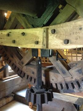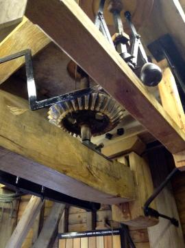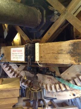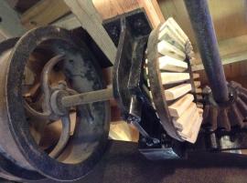 Interior image of Oldland Windmill, with detail of the sack hoist drive - date unknown.