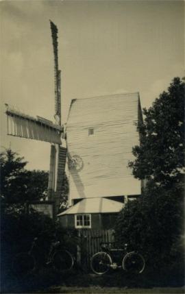 1934 exterior image of Oldland Windmill, with Sid SImmons' bicycle in the foreground on the right.