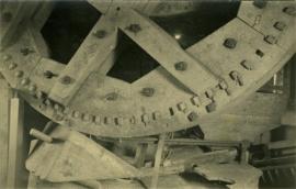 Interior image taken in 1932, showing the cogwheel and wedge inside Oldland Windmill.