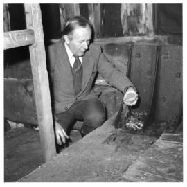 Photograph taken inside Oldland Windmill. Frank Gregory is examining rot in crowntree. Date unknown.