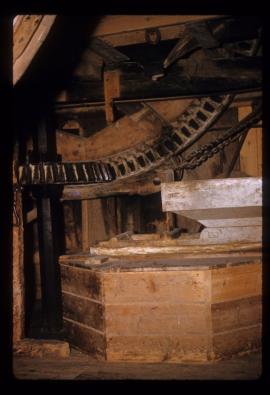 Interior view showing part of great spur wheel, stone nut and bridge tree below millstones