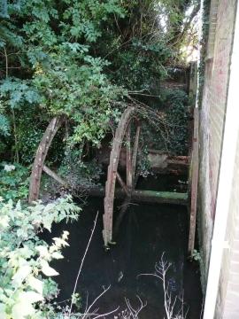 From Coles-Finch, 1933:- “Hothfield Mill is derelict and will never work again. I gleaned it was the oldest mill on the stream, nearly a thousand years old.” From Simmons Collection:- “Mill is used as a tea room” (PD, 1939). “Retains machinery, and Dennes work a Miracle Mill inside by power” (HRH, 1950). “The mill at Hothfield is often known as Potters Corner Mill and is still in good condition, although the wheel is rusting away.” (Alan Stoyel, 1964). From Jarvis, 1983 :- “This is still a busy mill but not water-powered and not grinding. Some interesting seed dressing equipment is present and is electrically driven. The skeleton of an iron overshot wheel showed it to have been powerful, but the present water flow is low, probably due to abstraction. It turned a pit wheel, which, complete with its iron wallower and what, for lack of a better word I will call a crown wheel, is all in a rectangular pit below ground level. The upright shaft once turned four pairs of stones, but only the spur wheel is left on its iron shaft under the hurst frame. The ‘crown wheel’ appears to have driven two layshafts below ground floor level in trenches for auxiliary power distribution.” Brief site visit, August, 2007:- (Rob Cumming) “It was converted into offices for a haulage company, c.1990. Building is in fine condition. The cog pit gearing has probably been retained, and the wheel is still outside, although just a frame.”